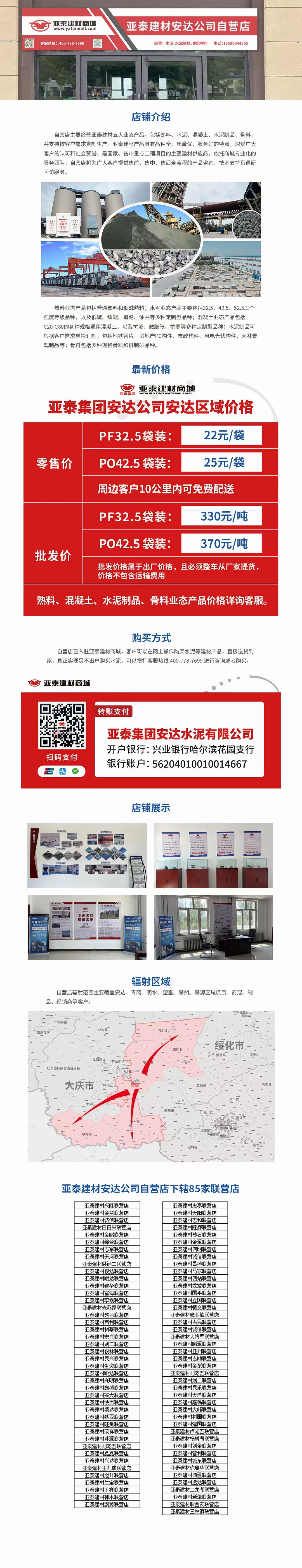 亚泰建材安达公司自营店主要经营亚泰建材五大业态产品,包括熟料、水泥、混凝土、水泥制品、骨料,并支持按客户需求定制生产。亚泰建材产品具有品种全、质量优、服务好的特点,深受广大客户的认可和社会赞誉,是国家、省市重点工程项目的主要建材供应商。依托商城专业化的服务团队,自营店将为广大客户提供售前、售中、售后全流程的产品咨询、技术支持和调研回访服务,实现客户扫码下单,物流配送到家。
