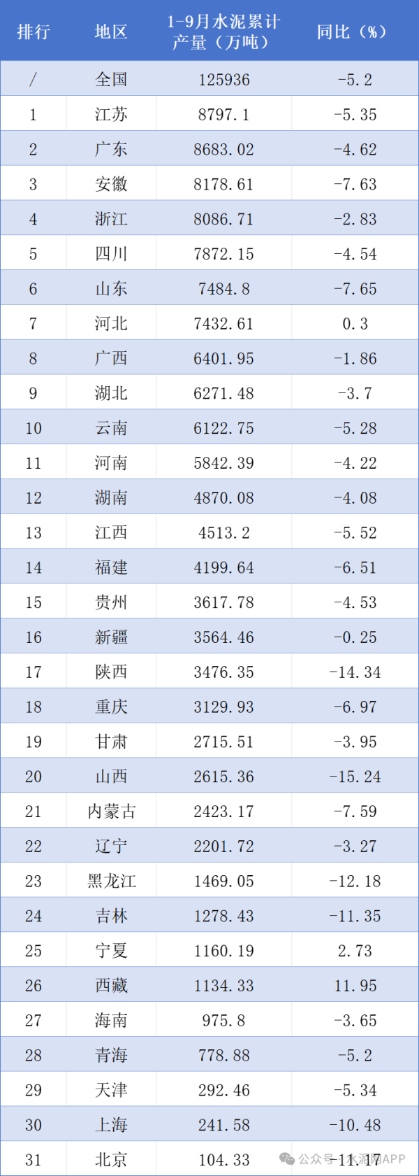 同比方面,仅河北、宁夏、西藏上升,其余省份下降,其中山西降幅最大为 15.24%,西藏增幅最大达 11.94%,整体水泥市场产量呈下行态势。